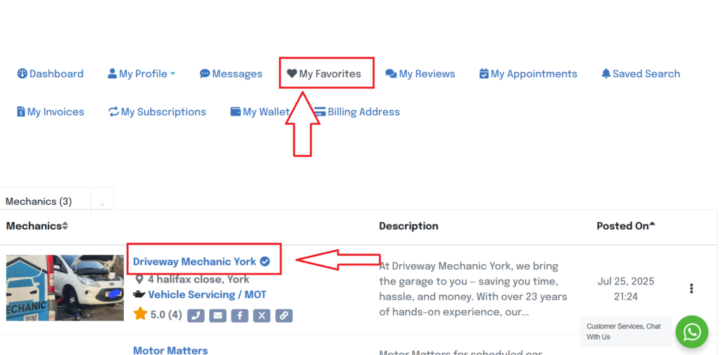 This can be found inside your Customer Dashboard, making it easy to return to mechanics you trust or want to book with later.