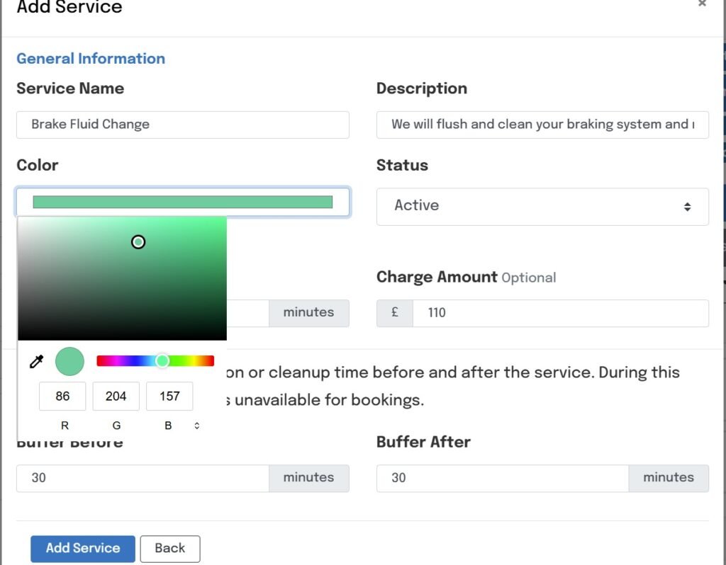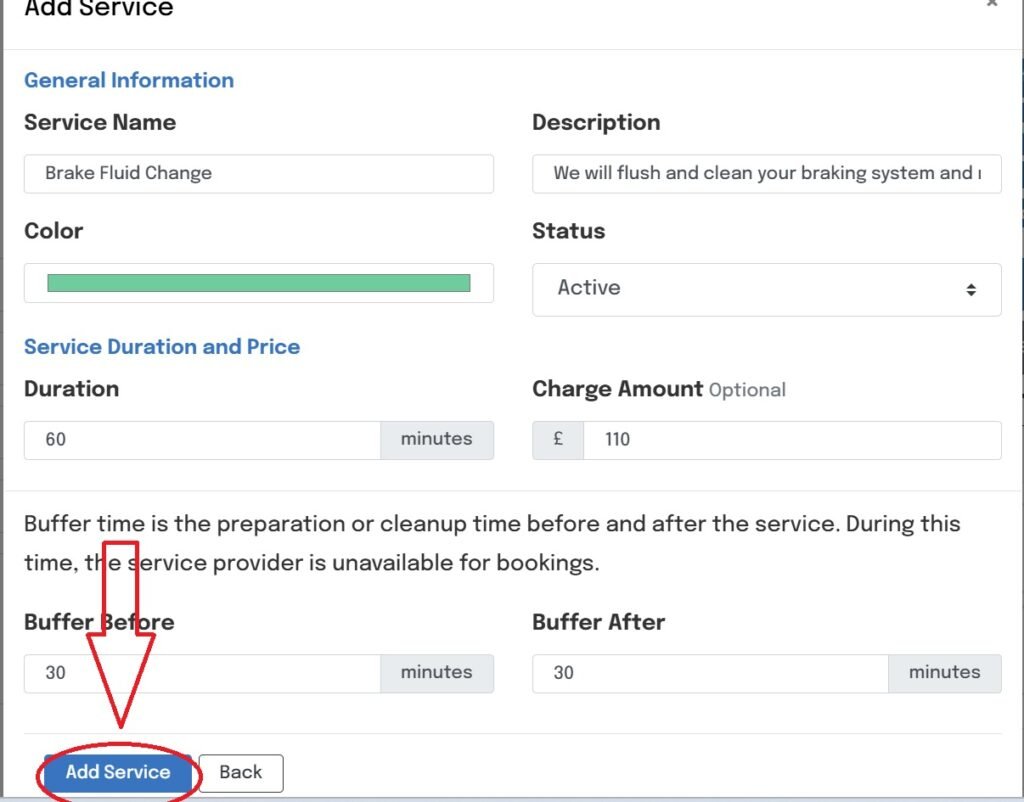 Status – Active/Inactive, mark the service as active to allow bookings or Inactive to make the service un-bookable